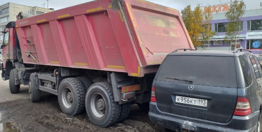В Мурманске на Кольском проспекте у дома 230 произошло ДТП. По информации из группы ВК «ДТП 51 помощь на дорогах Мурманска», КамАЗ врезался в легковой автомобиль Mercedes.