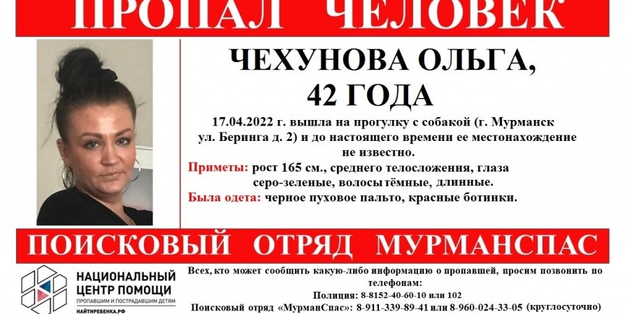 42-летняя мурманчанка Ольга Чехунова пропала после прогулки с собакой на улице Беринга.