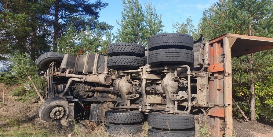 В Кандалакше сегодня около полудня в 100 метрах от дома №1-б на улице Восточная опрокинулся грузовой автомобиль КамАЗ-6520. Он был нагружен щебнем.
