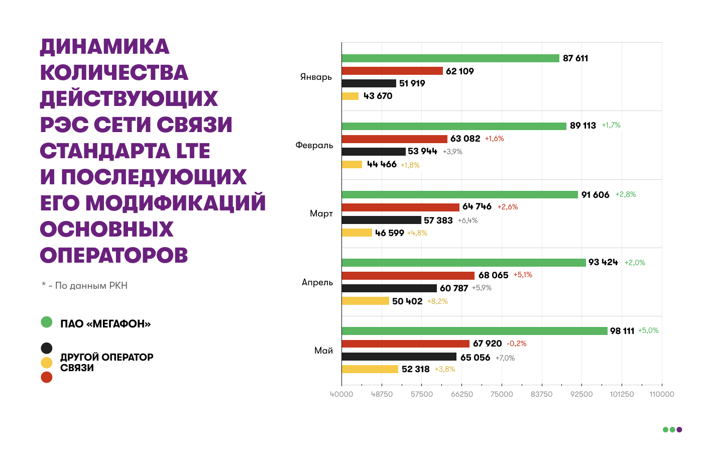 По данным Роскомнадзора, за 5 месяцев 2019 года количество базовых станций стандарта 4G операторов «большой четвёрки» в России выросло на 16% до 283,4 тыс. объектов, говорится в отчёте Роскомнадзора. При этом МегаФон владеет наибольшим числом базовых станций стандарта 4G - 98,1 тыс., а показатели остальных конкурентов значительно ниже - 67,9 тыс, 65,2 тыс. и 52,3 тыс.