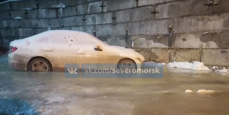 В Североморске на Душенова в районе дома № 26 припаркованное авто вмерзло в лед. Фотография попавшей в плен машины размещена очевидцами в соцсетях.