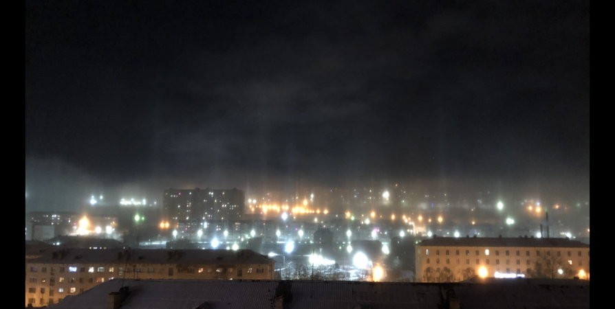 В Мурманске местные жители наблюдали световые столбы от городских фонарей в мороз до -19°. Обычно эта оптическая иллюзия возникает благодаря игре света с ледяными кристаллами, которые образуются в верхних слоях атмосферы.