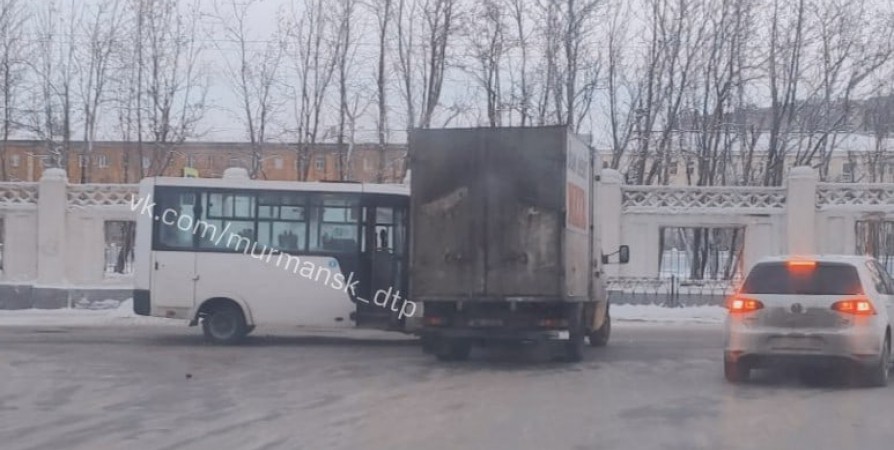 В соцсетях сообщили, что в Мурманске на пересечении улиц Ленинградской и Профсоюзов столкнулись маршрутка и грузовик.