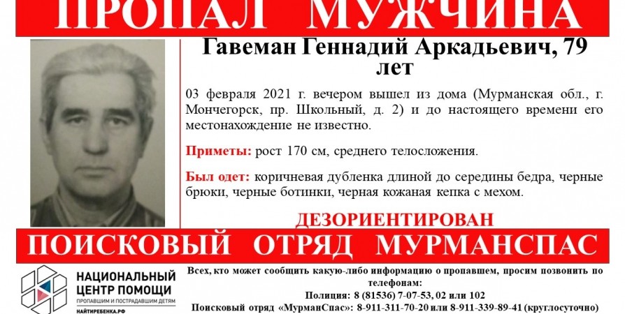 79-летний Геннадий Гавеман пропал в Мончегорске, сообщили волонтеры.