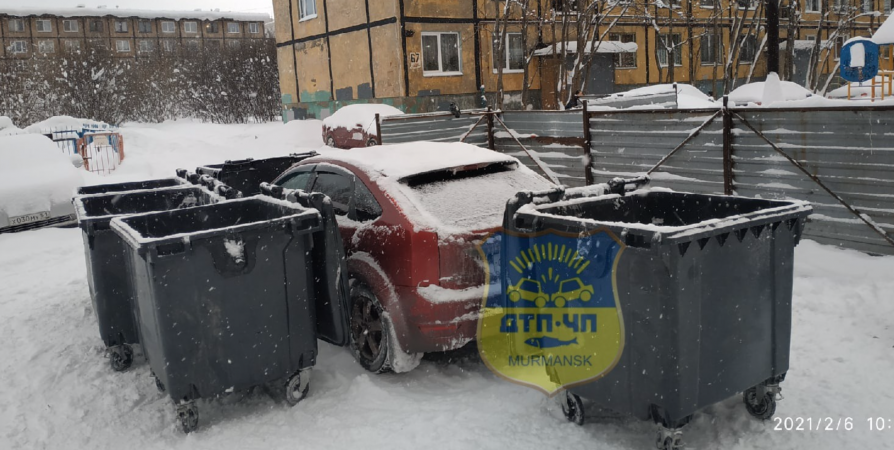 В Мурманске автомобилист припарковался рядом с мусорными контейнерами, в результате его машину забаррикадировали баками.
