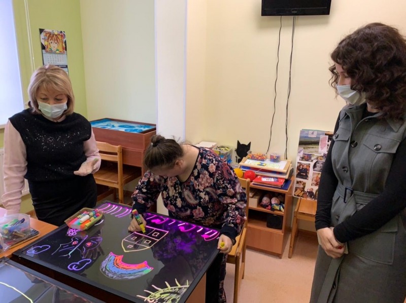 Здесь есть пищеблок, медицинский кабинет, физкультурный зал, кабинеты психолога, трудовой терапии, социально-бытовой ориентации, сенсорная комната и группы дневного пребывания.