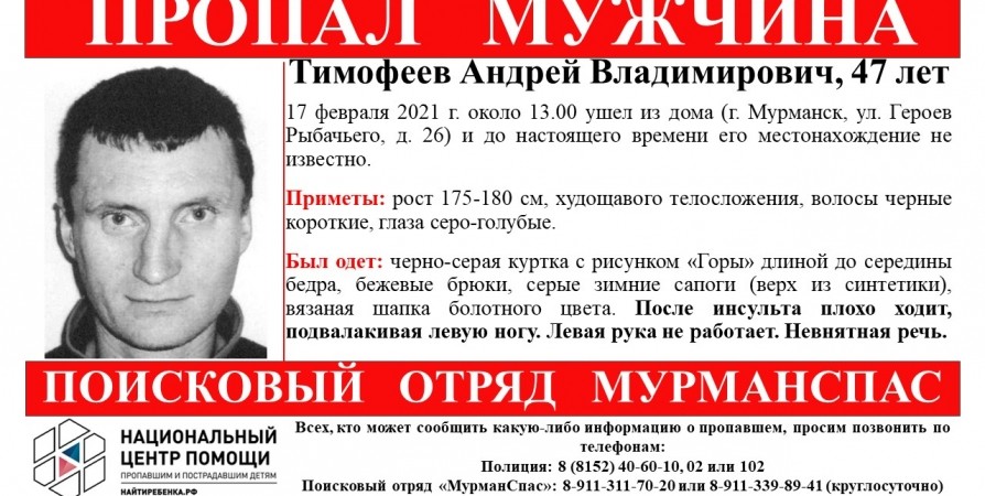 В областном центре ищут 47-летнего Андрея Тимофеева, сообщили в отряде «МурманскСпас».