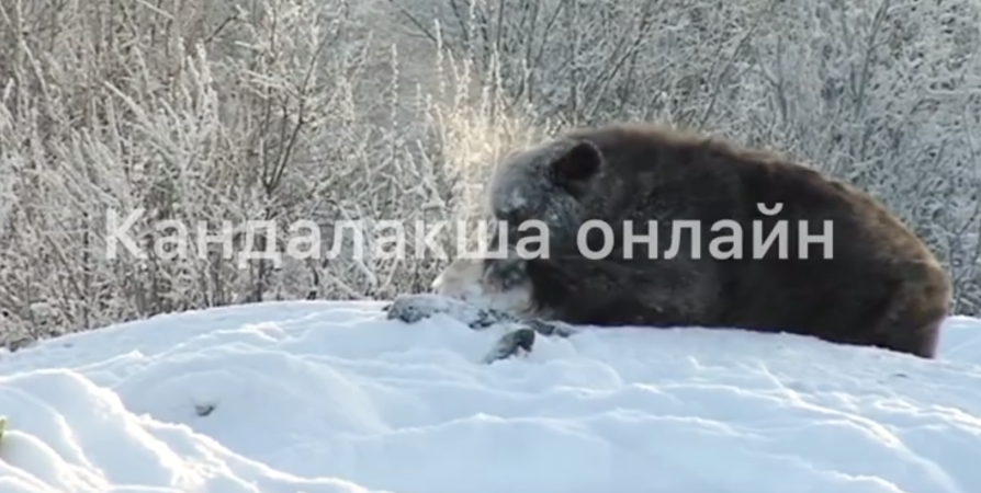 Видео с проснувшимся медведем с группой в ВК «Кандалакша онлайн» поделились подписчики сообщества.