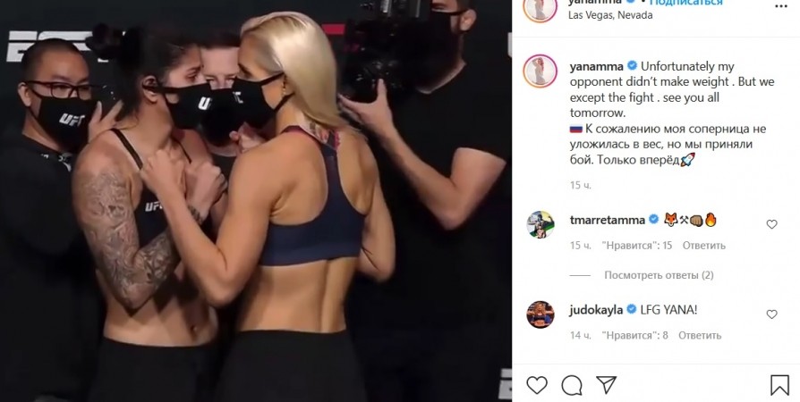- К сожалению, моя соперница не уложилась в вес, но мы приняли бой. Только вперед, - написала Яна Куницкая в своем Instagram.
