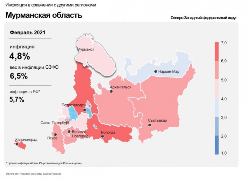 Годовая инфляция в Мурманской области в феврале 2021 года составила 4,8% после 4,5% в январе, но осталась ниже показателя по Северо-Западному федеральному округу (5,4%) и по России (5,7%). Об этом сообщает Мурманское отделение ЦБ.