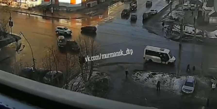 На перекрестке улиц Полярные Зори и Книповича в областном центре вчера вечером столкнулись две легковушки. Момент аварии попал на видео, которое в сеть выложили очевидцы.