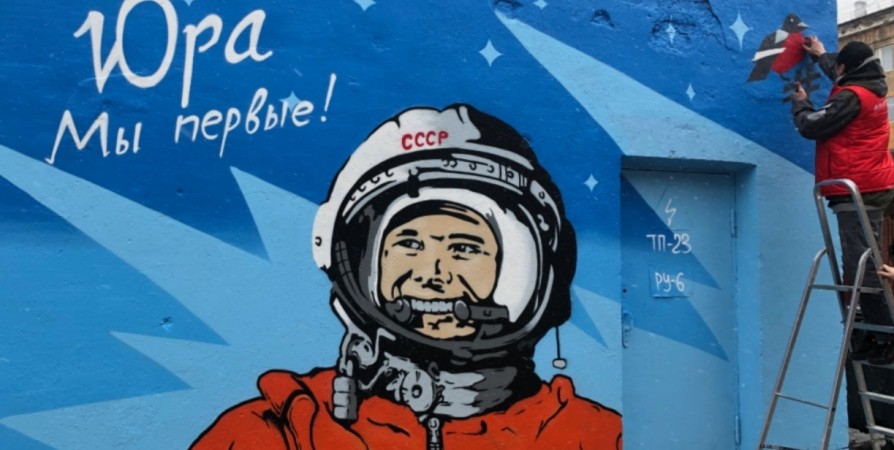В течение трех дней ребята вместе с граффитистом города наносили рисунок. Основой эскиза стала знаменитая фотография Юрия Гагарина в скафандре.