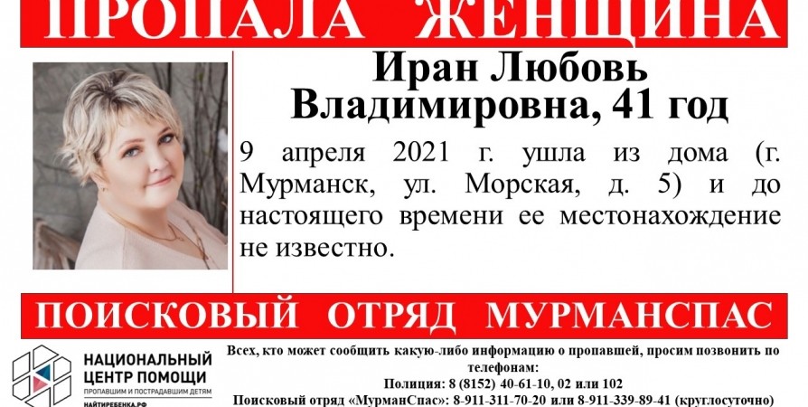 В областном центре ищут 41-летнюю Любовь Иран, сообщили в отряде «МурманскСпас».