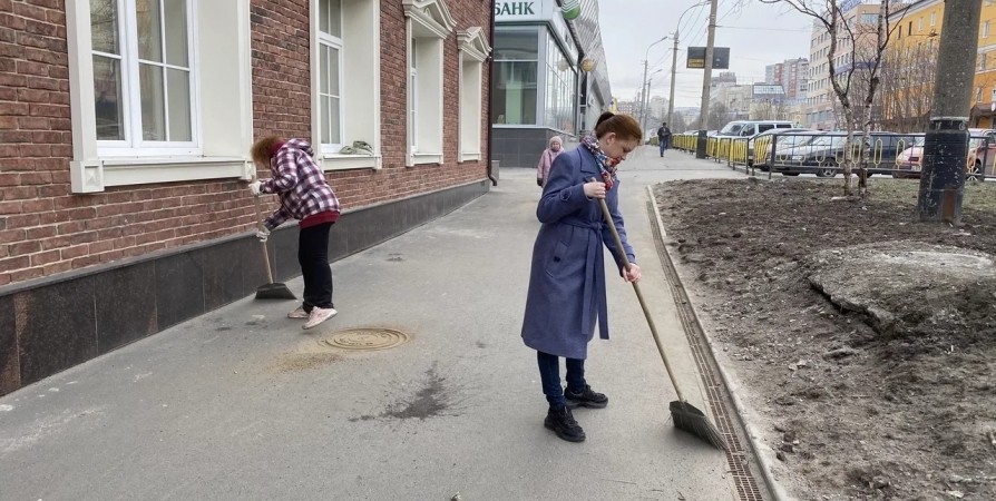 У здания Мурманского областного театра кукол на проспекте Ленина провели традиционный субботник.