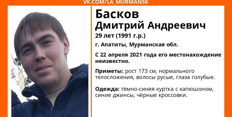 Около двух ночи 22 апреля 29-летний Дмитрий Басков вышел из дома по адресу город Апатиты, улица Сидоренко, 30, сел в такси темного цвета и пропал.