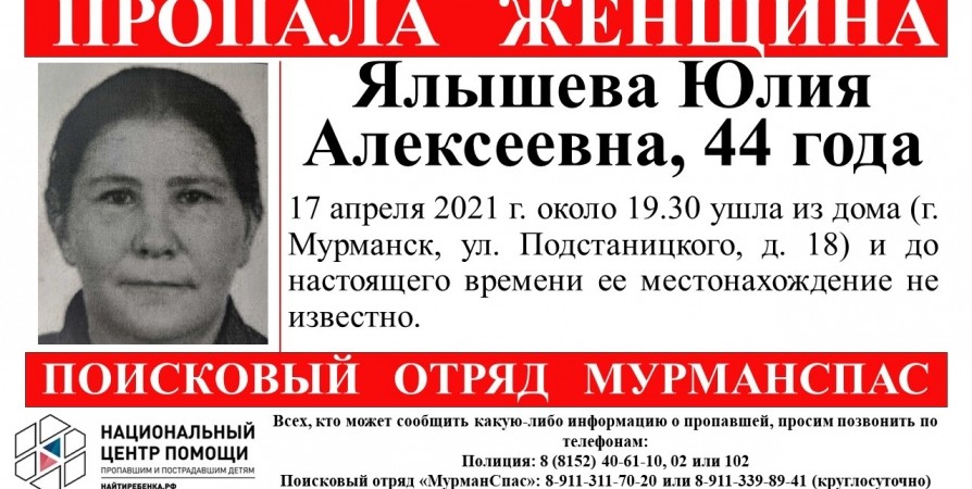 С середины апреля в Мурманске разыскивают 44-летнюю Юлию Ялышеву, которая ушла из дома по улице Подстаницкого и пропала.