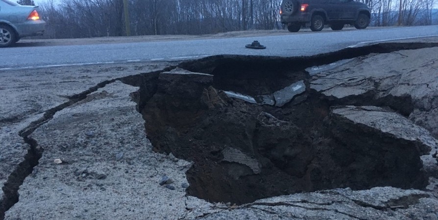 Судя по фотографиям, выложенным очевидцами в паблик ВК «Чистый город Североморск», глубина разлома около полутора метров.