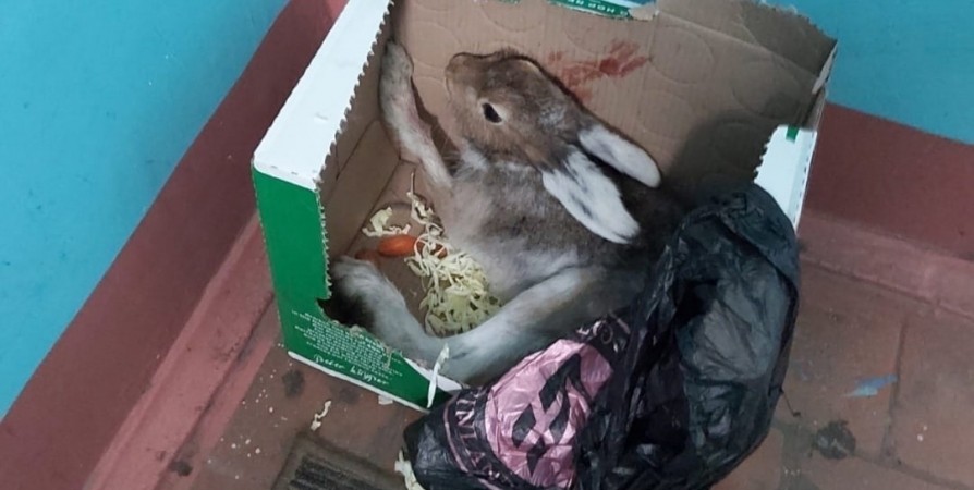 Сегодня очевидцы сообщили в соцсетях, что животное сбило машиной. Позже выяснилось, что после ДТП кто-то положил травмированного зайца в коробку и отнёс в подъезд домана улице Карла Либкнехта.