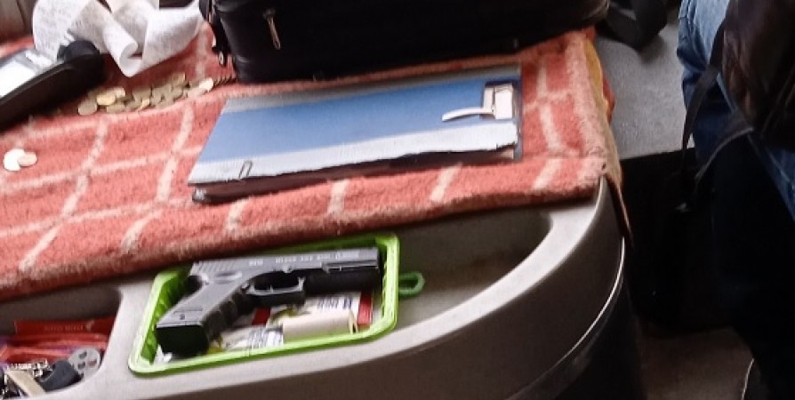 В паблике ВК «Мурманск» Маис Гусейнов опубликовал фото, на котором среди кассового аппарата и прочих вещей рядом с водителем лежит пистолет.