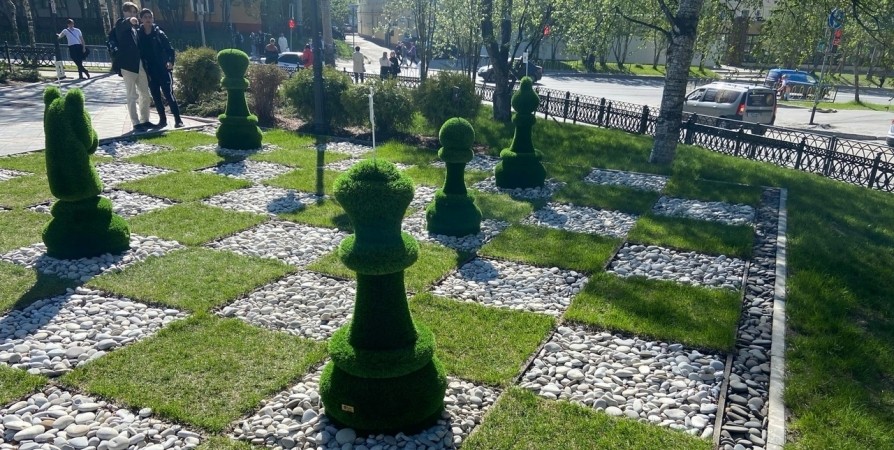 Пять огромных и зеленых шахматных фигур установили возле мурманского театра кукол на проспекте Ленина в сквере около дома 27.