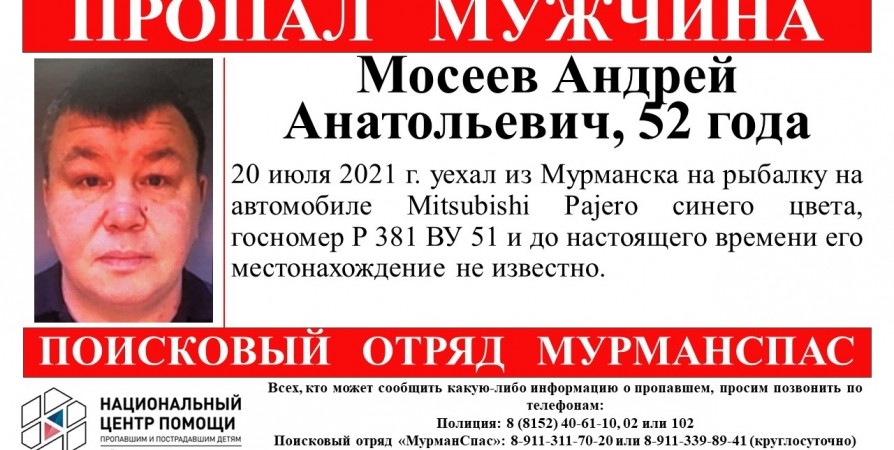 20 июля мужчина уехал из Мурманска на рыбалку на синем Mitsubishi Pajero с номером Р381ВУ51 и перестал выходить на связь.