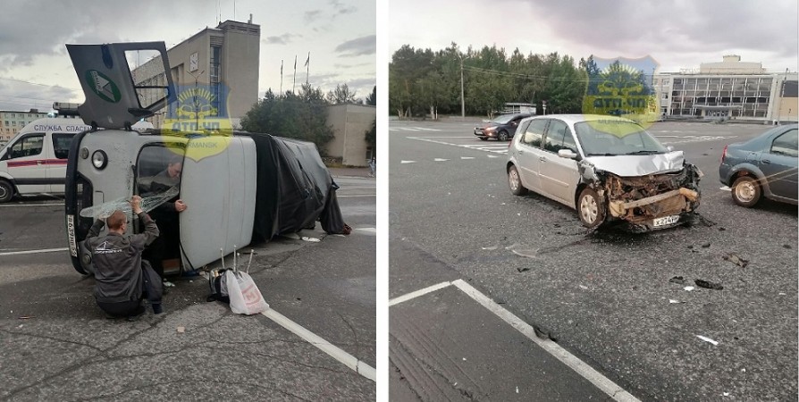 В центре Мончегорска вчера вечером произошла авария - столкнулись Renault и УАЗ. Последний от удара перевернулся на дороге.