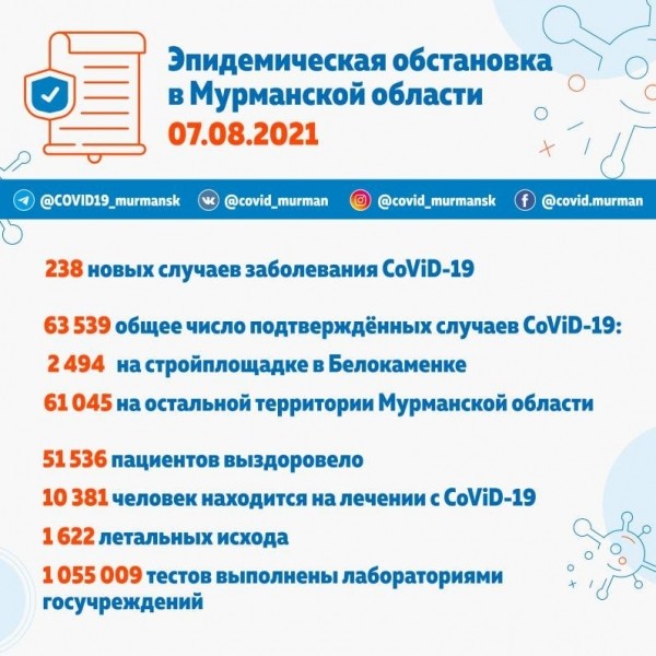 В Мурманской области выявлено 238 новых случаев заболевания CoViD-19. Общее число подтверждённых случаев заболевания новой коронавирусной инфекцией составляет 63 539.