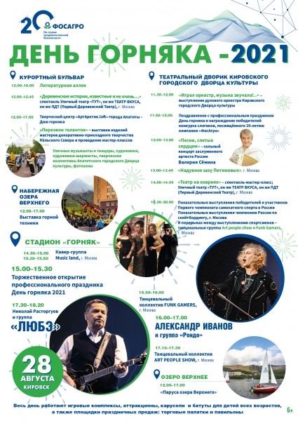 Более 15 творческих площадок, выступления столичных звезд, поздравления от руководства ФосАгро, которая в этом году отметит свое 20-летие, и новый автомобиль в подарок лучшему в профессии - все это ждет кировчан и гостей города в программе Дня горняка - профессионального праздника работников Кировского филиала АО «Апатит».