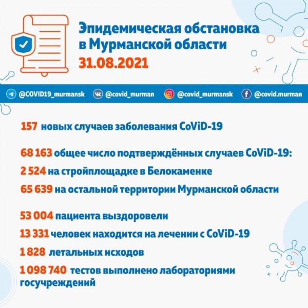 В Мурманской области выявлено 157 новых случаев заболевания CoViD-19. Общее число подтверждённых случаев заболевания новой коронавирусной инфекцией составляет 68 163.