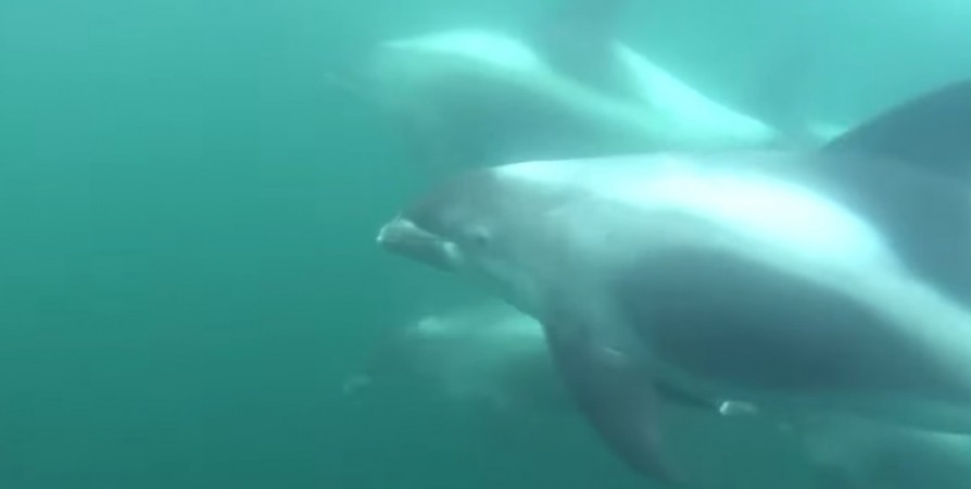 Стая беломордых дельфинов в Баренцевом море попала в объектив видеокамеры мурманчанина Антона Чайко.