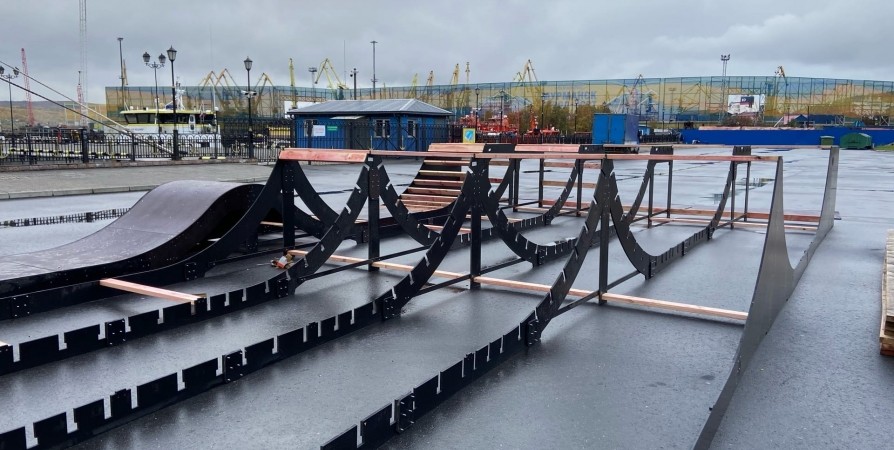 В Мурманске на площади у Морского вокзала продолжается монтаж скейт-рампы, сообщает в соцсетях Центр городского развития региона.