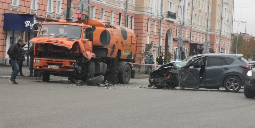 Сегодня утром в центре Мурманска столкнулись КамАЗ и Mazda CX-5. ДТП произошло рядом с плавательным бассейном, сообщили в группе ВК «Мурманск ДТП ЧП».