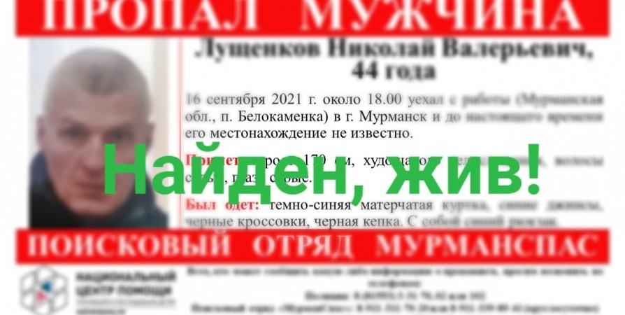 Николая Лущенкова, пропавшего 16 сентября, нашли живым. Об этом сообщает в своих соцсетях волонтерский поисковый отряд «МурманСпас».