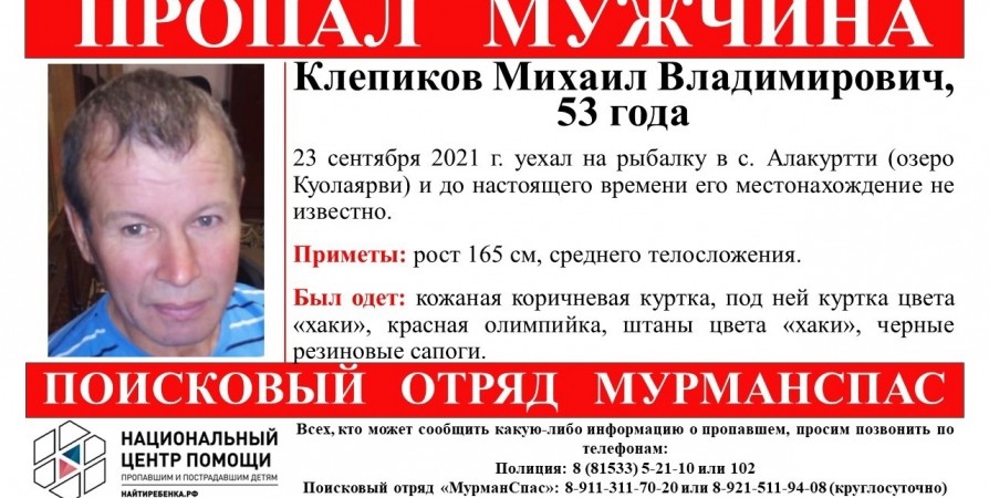 В Мурманской области ищут 53-летнего мужчину, пропавшего на рыбалке. Известно, что 23 сентября Клепиков Михаил Владимирович уехал на озеро Куолаярви в Аллакуртти. С того дня мужчина не выходил на связь и его местонахождение неизвестно.