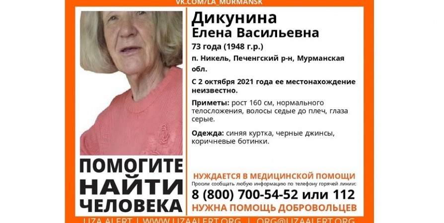 В Никеле пропала 73-летняя пенсионерка Елена Дикунина, нуждающаяся в медпомощи.