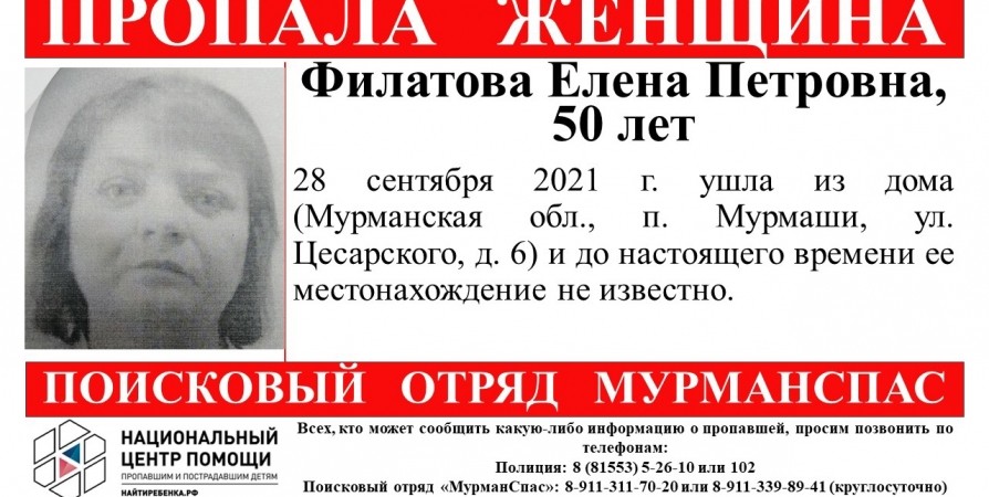 50-летнюю Елену Филатову ищут в Мурмашах с конца сентября, сообщили волонтеры.