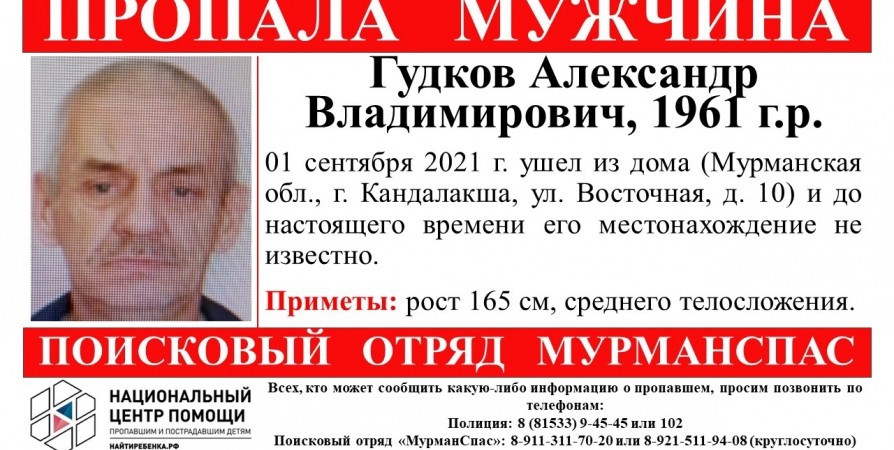 60-летний пенсионер Кандалакши Александр Гудков вышел из дома на улице Восточной и пропал 1,5 месяца назад.