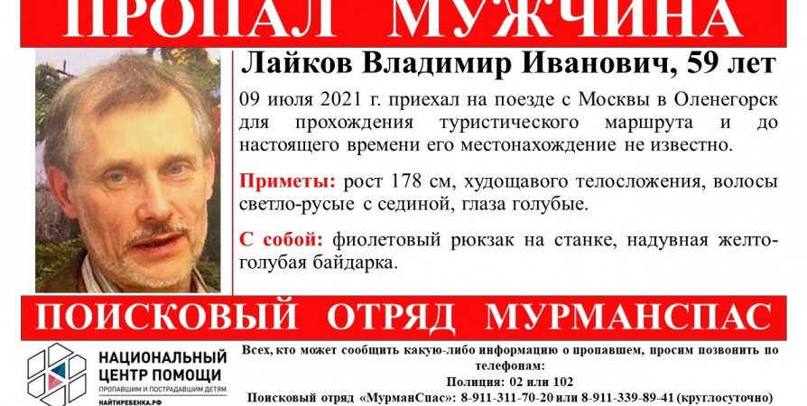 В Мурманской области пропал 59-летний мужчина. Владимир Иванович Лайков приехал из Москвы в Оленегорск для прохождения туристического маршрута. Как сообщили волонтеры, с 9 июля, когда он сошел с поезда, и до настоящего момента о его местонахождении ничего не известно.