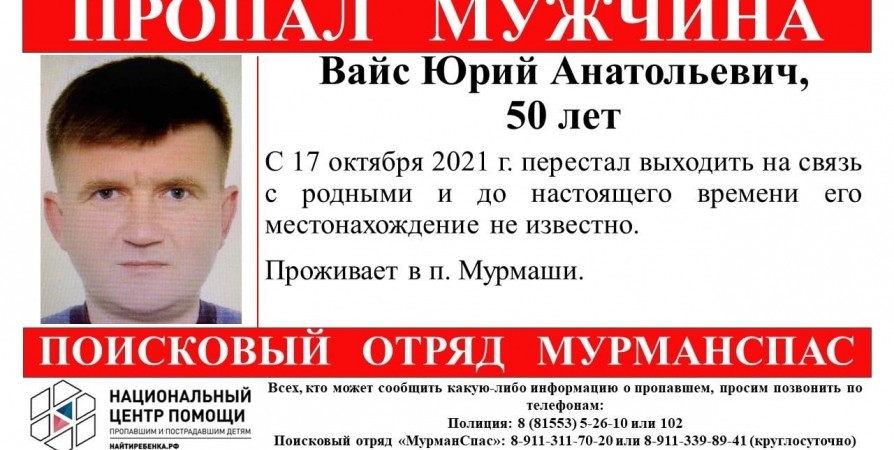 С 17 октября Юрий Анатольевич Вайс, проживающий в поселке Мурмаши, перестал выходить на связь со своими родными. С того дня о его местонахождении ничего не известно. Об этом сообщили волонтеры региона.