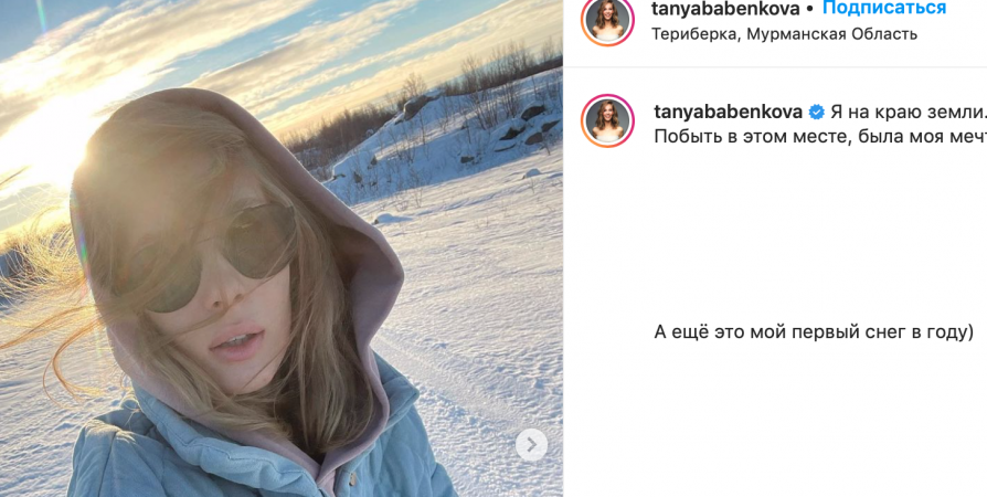 «Побыть в этом месте, была моя мечта. У меня есть блокнот, куда я записываю свои мечты и они сбываются или я их сбываю, но самое интересное, что все происходит легко и во время. [...] я живу в самом красивом номере, я мечтала посмотреть места где снимался «Левиафан» и я здесь, и я мечтала полететь хоть на край света и я тут», - написала Татьяна Бабенкова у себя в instagram.