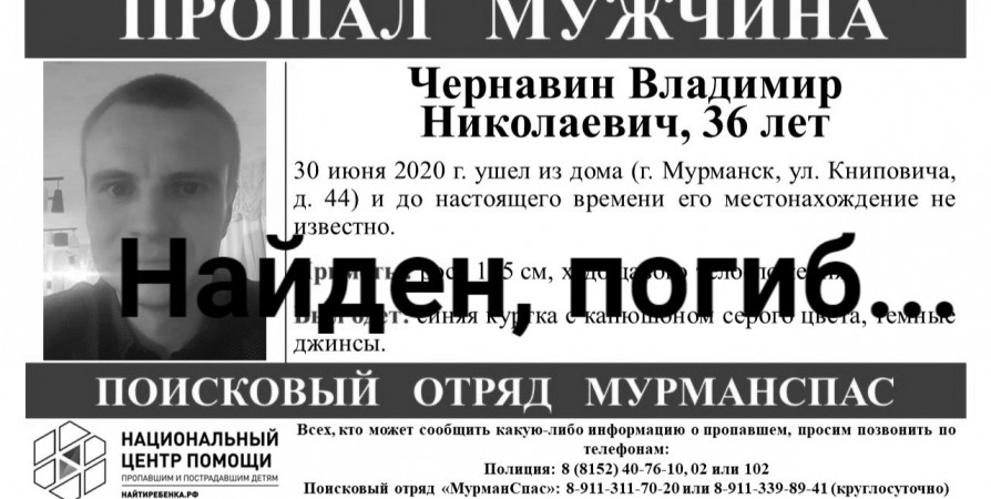 Пропавший в июне 2020 года мурманчанин Владимир Чернавин 36 лет погиб, сообщили волонтеры МурманСпаса.