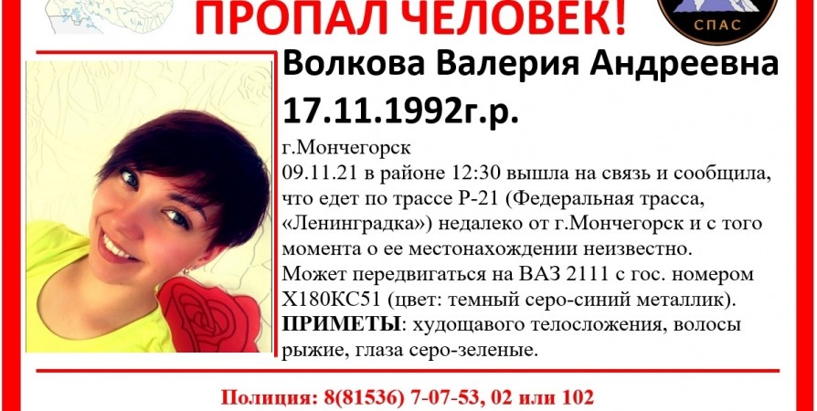 В Мурманской области пропала 29-летняя девушка. 9 ноября в 12.30 Валерия Волкова вышла на связь и сказала, что едет по трассе Р-21 недалеко от Мончегорска, после чего ее местонахождение неизвестно. Об этом сообщил поисково-спасательный отряд «СеверСпас».
