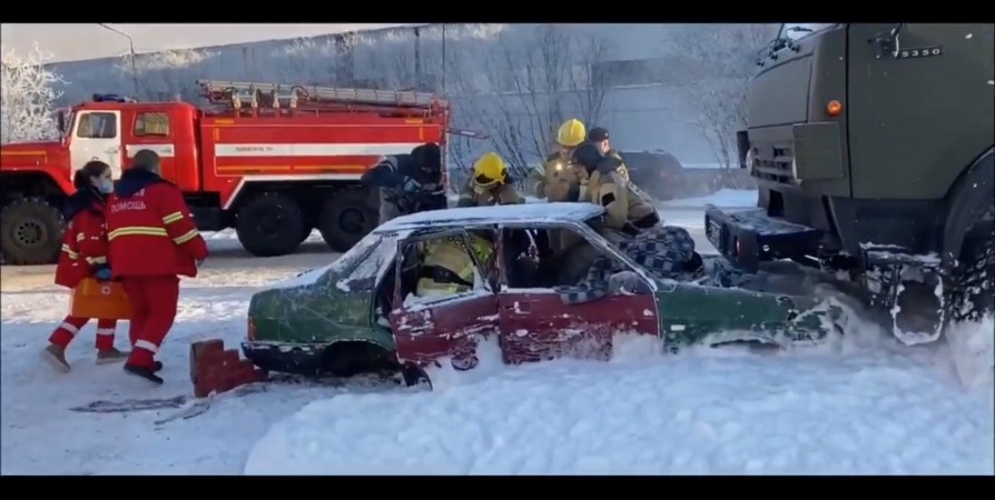 В Североморске на трассе около улицы Заводской произошло лобовое столкновение «КАМАЗа» и автомобиля «ВАЗ-21-99». Водитель и двое пассажиров легковушки оказались зажаты в салоне. Грузовик загорелся. Такую легенду на учениях, организованных ФПС №48 МЧС России, отработали спасатели совместно с пожарными, медиками и военной полицией.