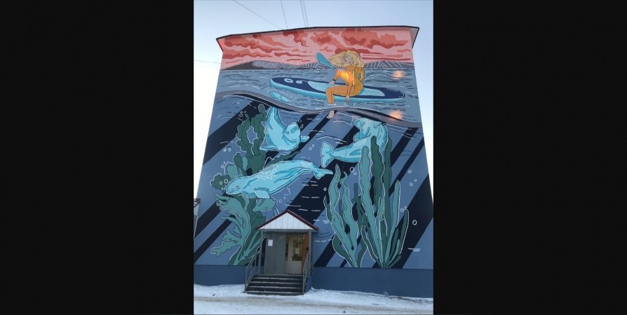 В Кандалакше от здания с муралом по улице Первомайской №53 убрали строительные леса. Теперь фасад дома украшает девушка на сапе в окружении белух. Об этом сообщили в группе «Кандалакша Онлайн» в социальной сети «ВКонтакте».