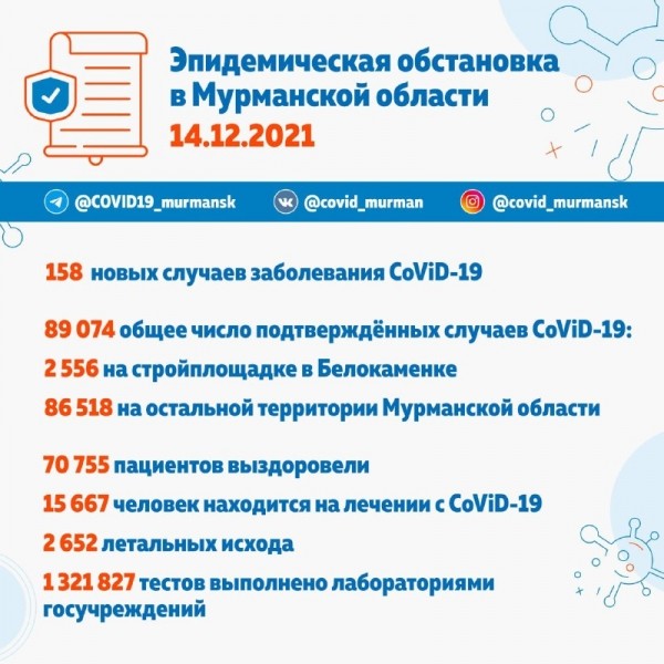 В Мурманской области выявлено 158 новых случаев заболевания CoViD-19. Общее число подтверждённых случаев заболевания новой коронавирусной инфекцией составляет 89 074.