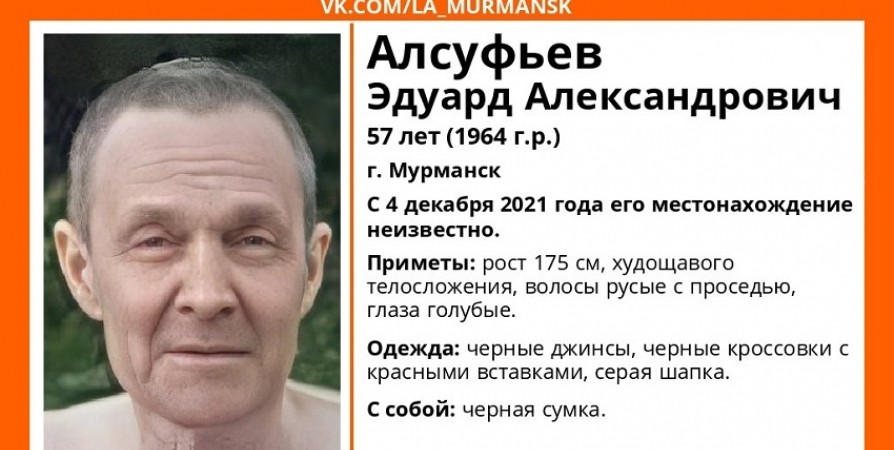 В начале декабря пропал 57-летний Эдуард Алсуфьев, с 4 числа о местонахождении мурманчанина ничего не известно.