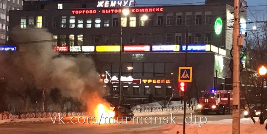 В Мурманске около ТЦ «Жемчуг» горело легковое авто. На месте работали спасатели и пожарные.