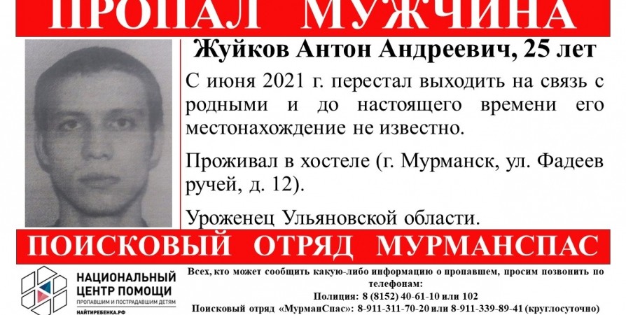- Жуков Антон Андреевич перестал выходить на связь в июне 2021 года и до настоящего времени его местонахождение не известно. Он проживал в хостеле на улице Фадеев Ручей №12, - рассказали волонтеры.