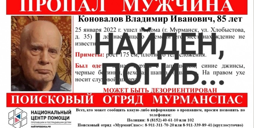 Пропавший 85-летний пенсионер из Мурманска Коновалов Владимир Иванович погиб, сообщили волонтеры.