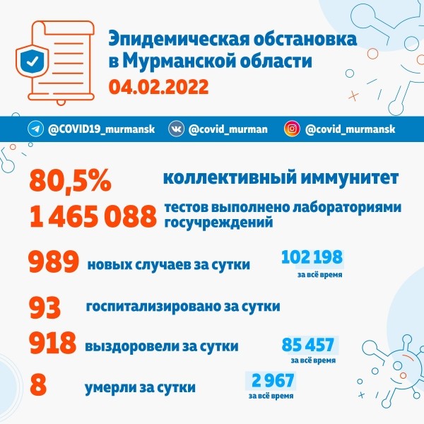 Напомним, что общее число подтверждённых случаев заболевания новой коронавирусной инфекцией в Заполярье составляет 102 198, в том числе 9760 в Североморске (+174), 7876 в Кандалакшском районе (+51), 7641 в Мончегорске (+24), 5655 в Оленегорске (+47), 4906 в Печенгском округе (+27), 4699 в Кольском районе (+19), 3377 в Апатитах (+26), 2477 в Ковдорском районе (+36), 1787 в Ловозерском районе (+5), 1475 в Кировске, 870 в Терском районе (+1), 212 в ЗАТО Видяево, 21 в Полярном, 6 в Снежногорске, 6 в Полярных Зорях, 3 в ЗАТО Заозерск.